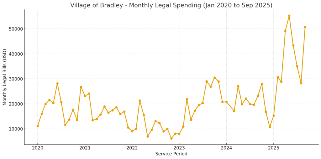 For the price of repaving long-neglected streets or hiring more first responders, the Village of Bradley poured more than a million public dollars into something far less useful: a silent, airtight legal shield. A review of 69 monthly invoices and years of related documents shows a pattern of rising legal spending, accelerating secrecy, and a public information system perfectly engineered to keep residents in the dark.